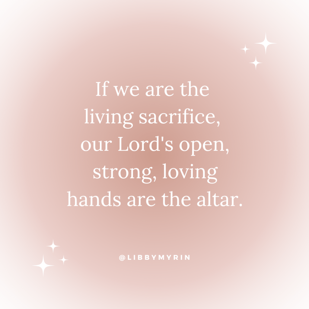 While a variety of things may come to mind when reading the word ‘sacrifice’, the meaning that truly ignites my soul is our acknowledging that we need less of ourselves and more of Jesus. If we are the ‘living sacrifice’, our Lord’s open, strong, loving hands are the altar. We’re going to jump all in, seek Him first, replace lies with His truth, honor our bodies as His temple, and realize His love and grace bring true freedom. The phrase ‘Spirit-led’ might sound churchy, but I’ve learned ‘me-led’ is exhausting and doesn’t have much impact. By pressing ‘pause’ to step back, get out of His way, and ask, ‘Spirit, lead me in this,’ we can move forward with greater peace and passion.
