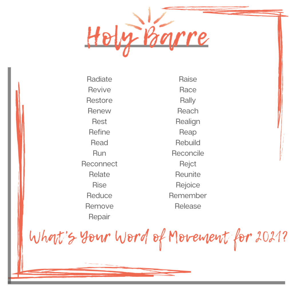 I fully believe this new year is not a redo of our 2020 plans, but a revival for our heart, soul, strength, and mind! And staying true to my love of themes and parallels, Holy Barre’s focus will revolve around words that begin with R . . . Revival. Revelation. Refine. Radiate. The Book of Romans . . . So lastly, I encourage you to select a word of movement for 2021. Here’s a list to get you thinking!