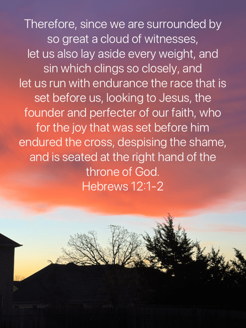 Therefore, since we are surrounded by such a huge crowd of witnesses to the life of faith, let us strip off every weight that slows us down, especially the sin that so easily trips us up. And let us run with endurance the race God has set before us. We do this by keeping our eyes on Jesus, the champion who initiates and perfects our faith. Because of the joy awaiting Him, He endured the cross, disregarding its shame. Now He is seated in the place of honor beside God’s throne.