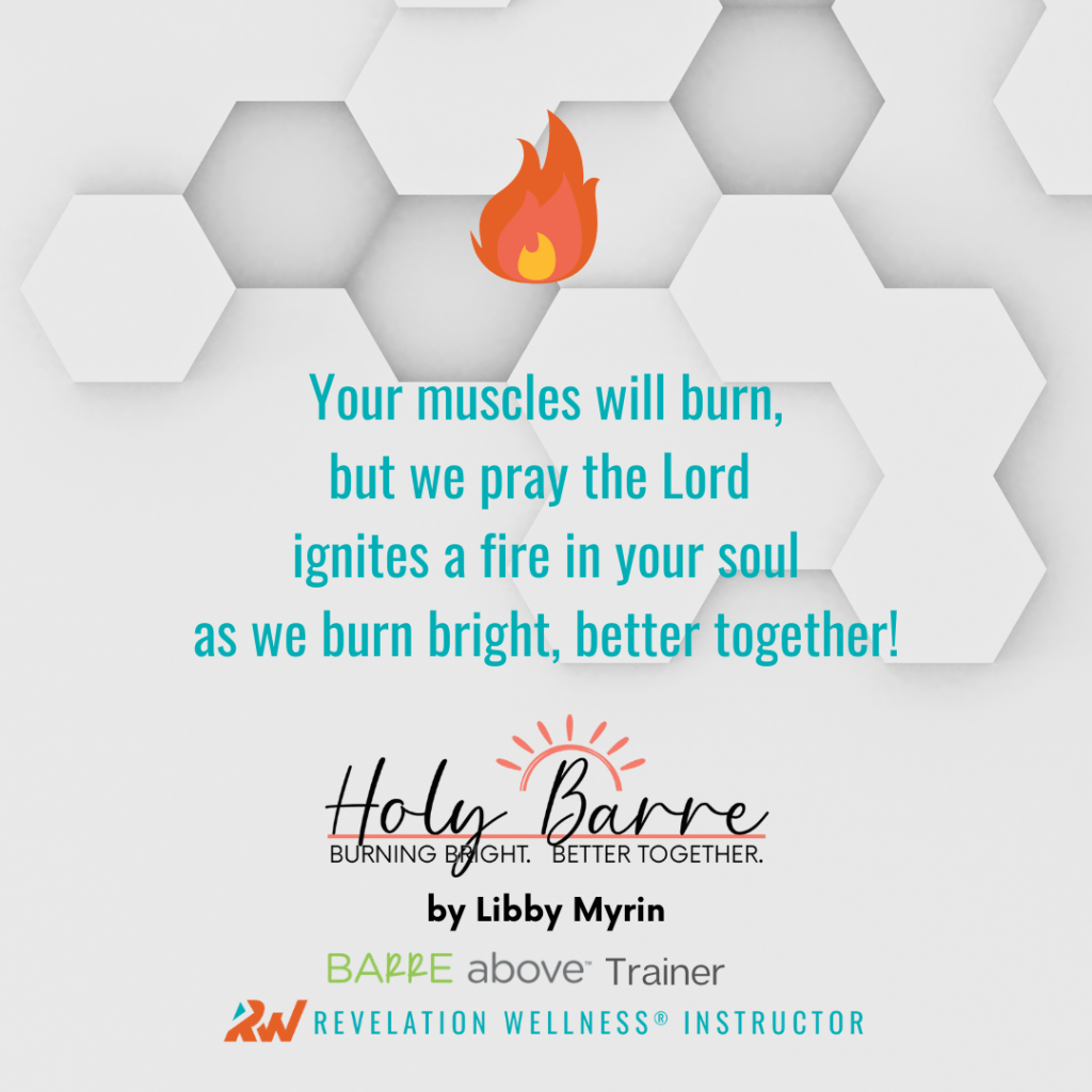 We’d love for you to become a part of the Holy Barre community! While you can follow along on social media (links in bottom right of page), these opportunities listed are where the real results and relationships happen! Ultimately, we invite you to join us on a journey towards health, wholeness, and holiness! And our prayer is through these opportunities, the Lord clears your mind, calms your soul, fills your heart, and strengthens your body as we burn bright, better together!